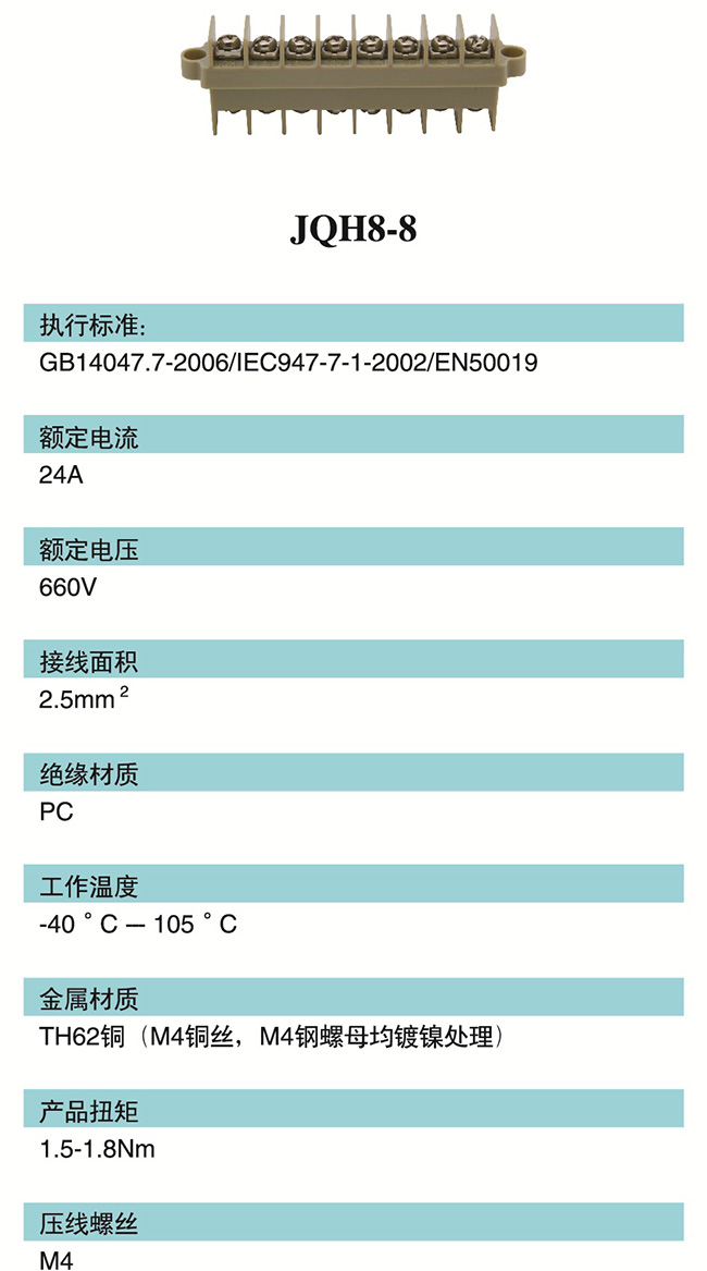 JQH8系列繼電保護(hù)端子,是為國(guó)內(nèi)外繼電保護(hù)裝置而開(kāi)發(fā)的電流端子;主要應(yīng)用于各類(lèi)電力,電子,儀器裝置、繼電保護(hù)裝置等機(jī)箱穿墻類(lèi)型電路進(jìn)出線(xiàn)連接,適用導(dǎo)線(xiàn)2.5mm2,其設(shè)計(jì)合理,結(jié)構(gòu)緊湊,接線(xiàn)直觀可靠,使用方便,端子絕緣材料采用高性能PC工程塑料,阻燃達(dá)到UL94-V0級(jí),電氣機(jī)械性能良好,導(dǎo)電體和組合螺釘標(biāo)配銅合金螺釘,能確保產(chǎn)品保持有效的氣密度,低阻值,永久性連接,保證接線(xiàn)的可靠。被廣大工程師選用;有多種規(guī)格可供選擇,還可根據(jù)客戶(hù)要求開(kāi)發(fā)相應(yīng)的回路端子。(JQH8-8P、JQH8-10P 、JQH8-12P、JQH8-16P)等。