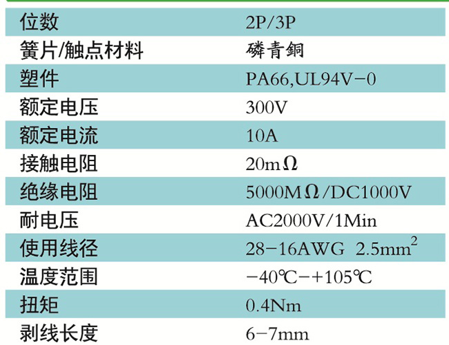 接線端子的絕緣材料用改性的尼龍(PA66),能達到或超過IEC947-7-1及EN60947-7-1標準,阻燃等級達到UL94,V-0具有良好的電氣性能和機械性能。螺絲用高強度的鋼制成鍍鋅或鎳處理,導電體四方針用合金銅制成表面鍍錫,壓片采用彈性及極強的磷青銅表面鍍錫或鎳;壓線框用抗應力裂縫腐蝕的合金銅制成,這些金屬表面還鍍錫或鍍鎳加以保護。設計完全符合IEC60947-7-1.GB14048.7等標準。